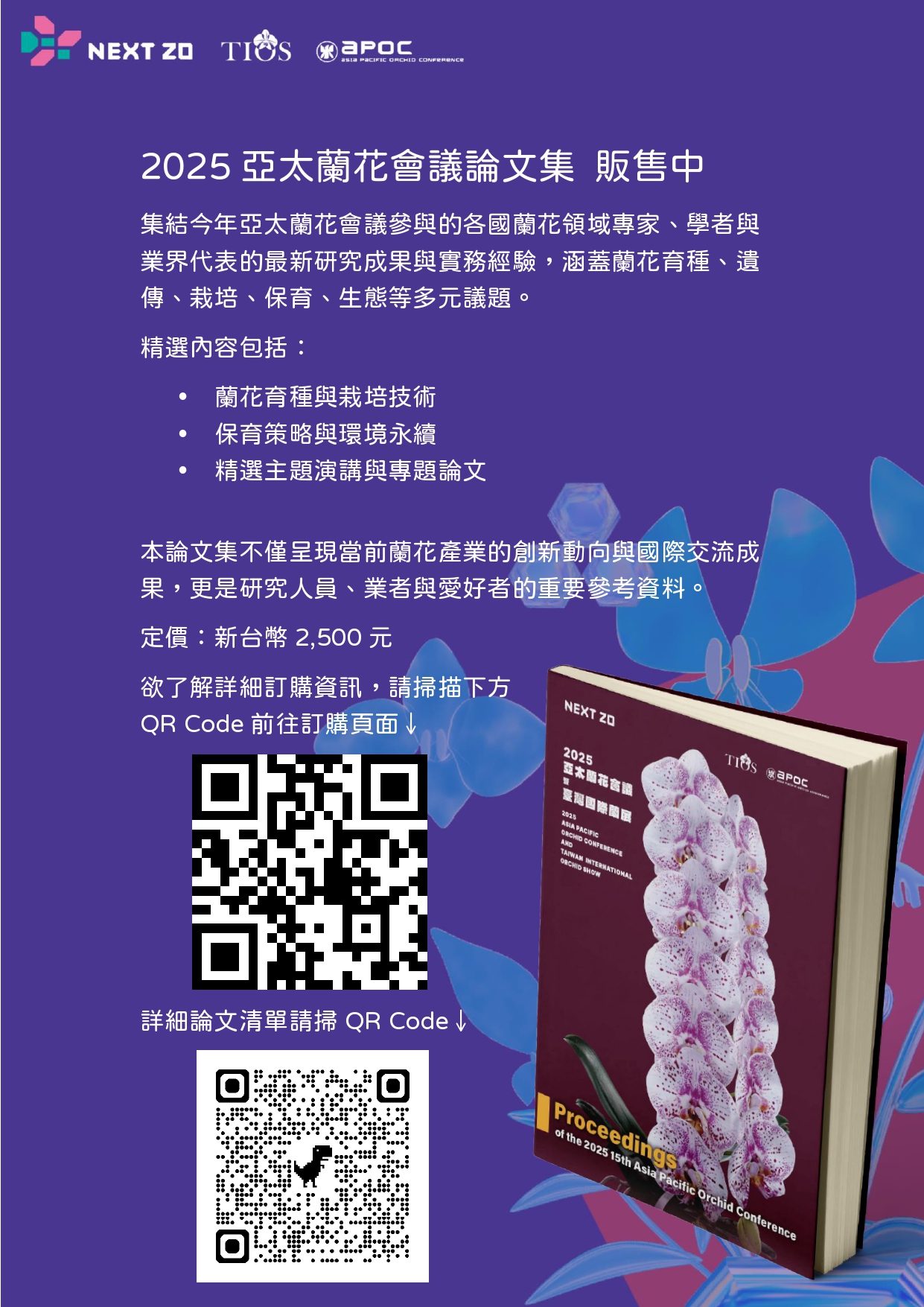 集結來自各國蘭花領域專家與產業代表的最新研究成果與實務經驗,涵蓋蘭花育種、栽培、保育、生態等多元議題,這本論文集不只是知識的寶庫,更是研究人員、業者與愛好者的重要參考資料!